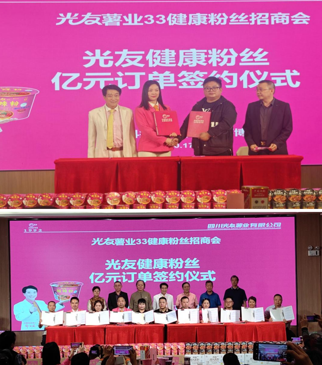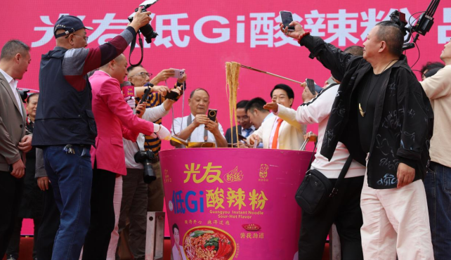 世界最大碗的光友低Gi酸辣粉亮相,引起现场嘉宾精叹,开水冲泡更是将光友低Gi酸辣粉的鲜、香、麻、辣以及粉丝柔软劲道与低 Gi营养优势直观呈现。品鉴后,嘉宾们纷纷点头点赞,不少人当场表示 “口感清爽不腻,作为健康主食很合适”、“没想到低 Gi 粉丝也能有这么好的嚼劲!”,即时反馈为产品口碑打下坚实基础。经销商、福利团供平台分销商纷纷下单,订单突破 2.5亿元。