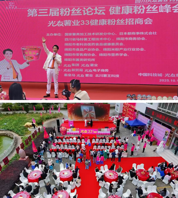 10月22日讯:2025年10 月 17 -19日在中国科技城光友红薯博物园隆重召开《第三届粉丝论坛 健康粉丝峰会》、《光友薯业33 健康粉丝招商会》、《光友粉丝杯“美丽祖国.科技绵阳”诗歌大赛》。本次活动主办单位:国家薯类加工技术研发分中心、日本都商事株式会社、四川省马铃薯工程技术研究中心、四川大学文旅康养校友会、绵阳市商务协会 、绵阳市老科协医药食品健康委员会、绵阳市老科协商贸文旅法治委员会、绵阳市食品产业协会、绵阳米粉产业行业协会、绵阳市零售商协会、绵阳市营养学会、绵阳市薯类研究所、四川省通俗文艺研究学会、四川省老年诗词创作研究学会、绵阳市老年大学,承办单位:光友集团、光友薯业,支持单位:光友新贸易、光友电子商务、秦皇岛光友薯业、四川薯王食品科技等。