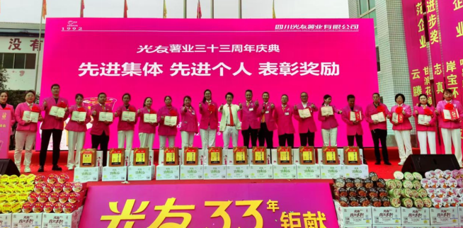 峰会特设光友薯业 33 周年庆典优秀员工表彰环节。现场为表现突出的员工颁奖,肯定其在企业发展中的付出,以榜样力量激发全员积极性,进一步凝聚团队协作力,为企业持续推进健康粉丝产业、拓展发展版图注入动力。