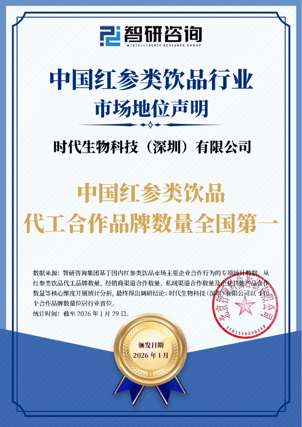 重磅权威认证!经国内顶尖市场研究机构“智研咨询”多维度专项调研与高精尖专家团深度论证,时代生物科技(深圳)有限公司凭借在红参类饮品代工领域的技术深耕、研发积淀与全链路专业服务,荣膺“中国红参类饮品代工合作品牌数量全国第一”行业地位!这一认证,是行业对时代生物专业实力的高度认可,更是千百家合作品牌用选择给出的硬核答案。